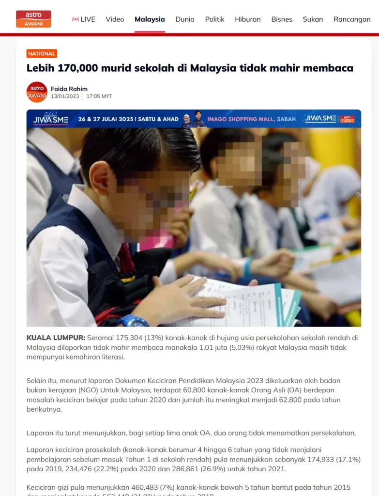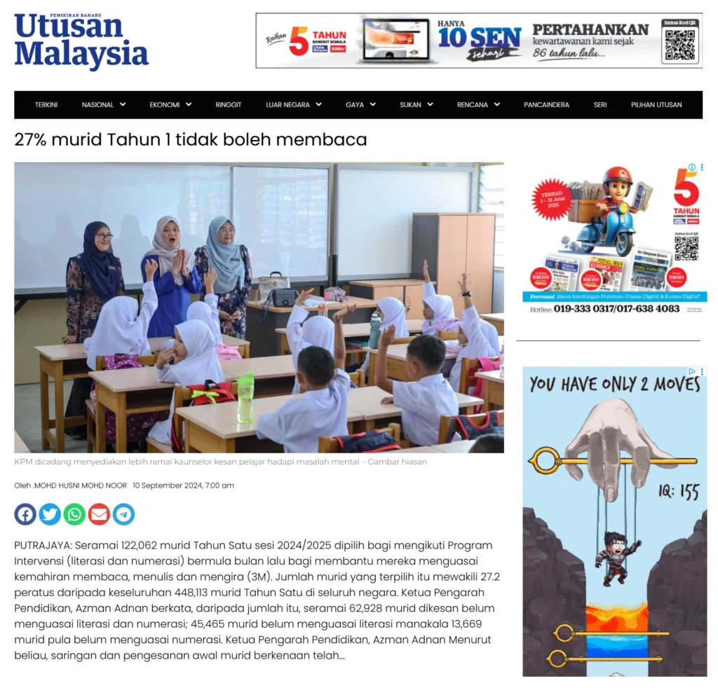 📊 170,000 murid sekolah rendah tidak mahir membaca